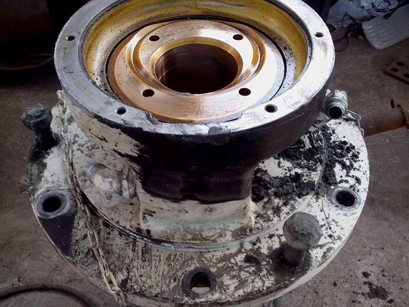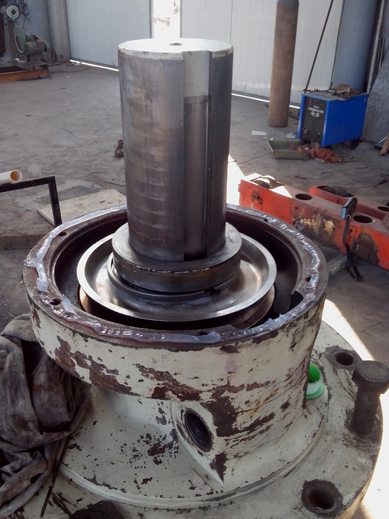 2014-06-09 客戶(hù)HP500圓錐破碎機(jī)的水平軸殼體因過(guò)度磨損不能繼續(xù)使用,運(yùn)到我公司維修。由我司技術(shù)人員拆解水平軸總成,更換新的水平軸殼體,銅套,護(hù)板。